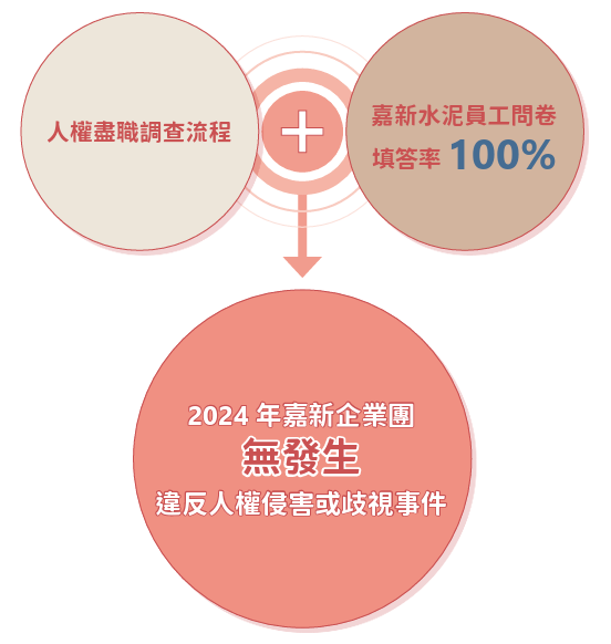 嘉新調查結果顯示無發生違反人權侵害或歧視事件,並依據調查結果與人權潛在風險議題發生可能性,擬定相關減緩措施且100%實施。