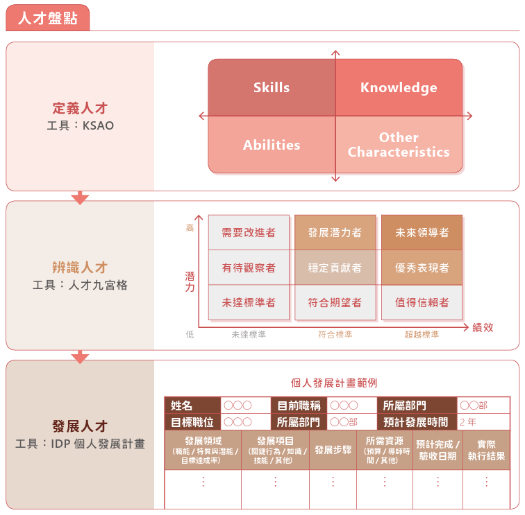 每年第4季定期進行部門人才發展計畫,涵蓋人才標準建置、人才分析與人才培育。各部門依據短期、中期及長期目標,檢視其部門內相應人員能力是否符合目標需求與職能定義。同時,根據未來一個年度的工作重點及專案需求,規劃培育計畫,包含: